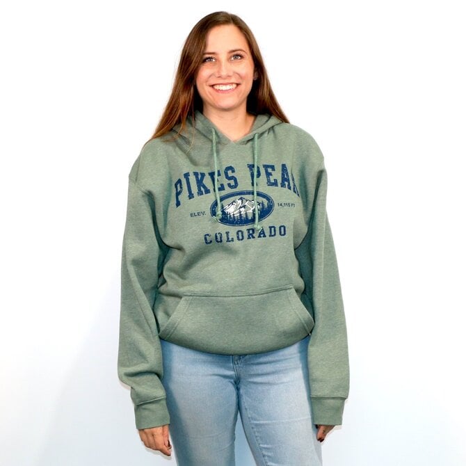 Polyester and Cotton blend hooded sweatshirt. Proudly features Pikes Peak Mountain, Colorado logo with mountain design!