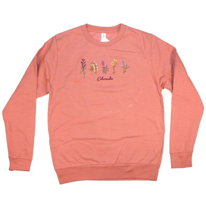 Five Flowers are embroidered onto this crew neck sweatshirt with Colorado text. This super-soft cotton-blend pullover provides high quality comfort! Ribbing at the edges and cuffs makes this sweatshirt extra durable.