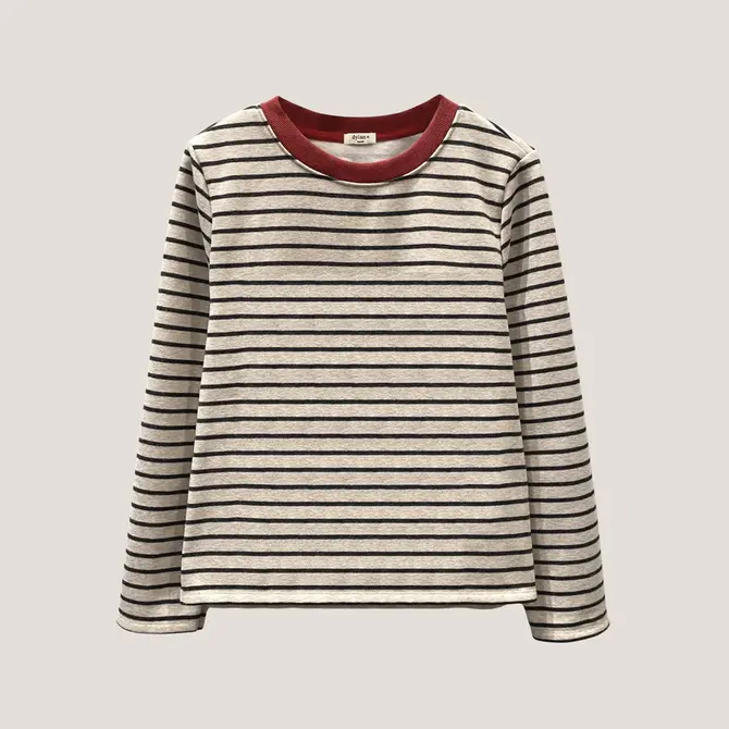 cotton-blend, brushed inside w/ dark red contrast collar and black stripes