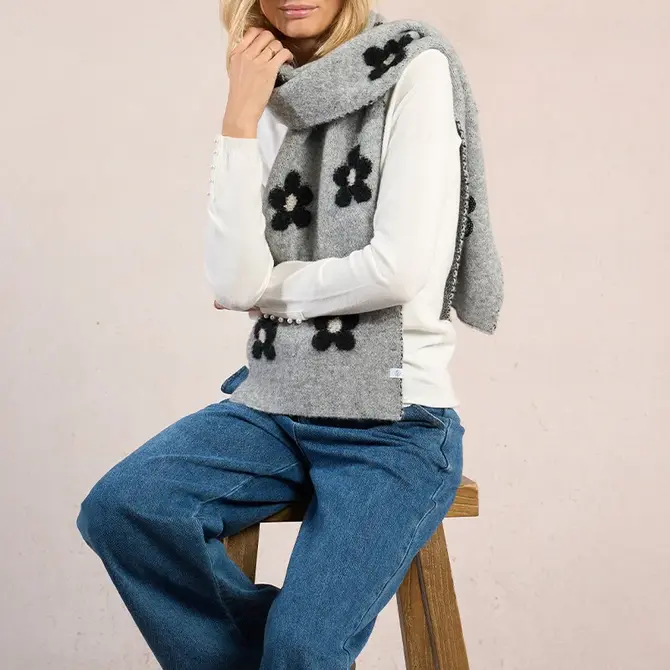Warm knitted scarf with rhinestone flower pattern. Comes in colors grey and off-white!