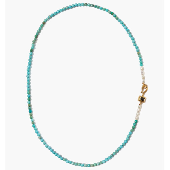 A vibrant and bright strand of natural turquoise beads is tied together with freshwater rice pearls and an 18k gold plated sterling hook with a hypersthene pendant.