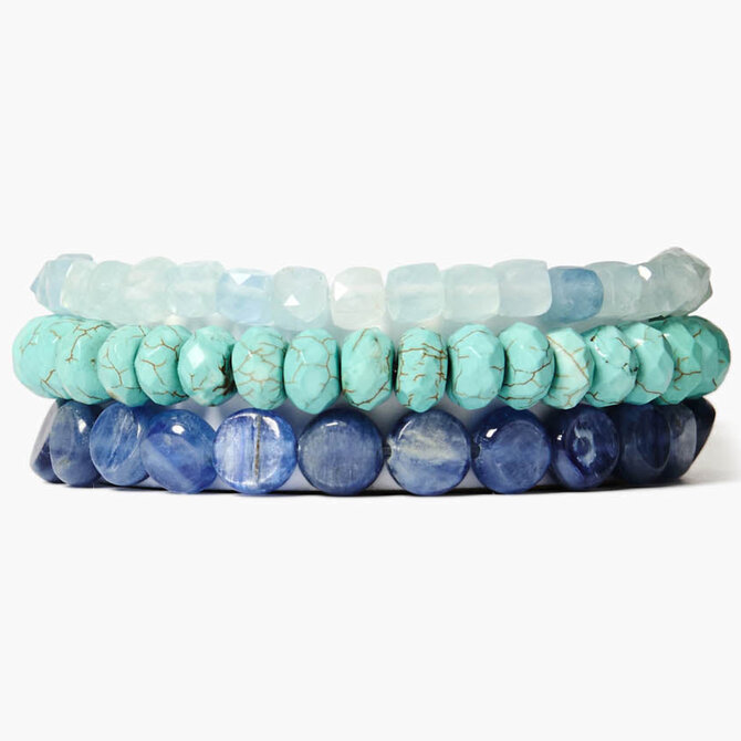 A gorgeous set of three stretch bracelets with genuine turquoise, aquamarine, and kyanite gemstones.