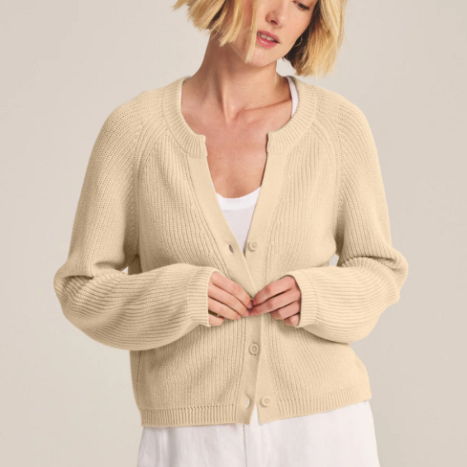 Classic cardigan with chunky textured Pima cotton knit. Ribbed trims and a 4-button front, open top for a relaxed look. Breathable with great stretch, it’s a versatile layering piece that adds a cozy texture to any outfit.
