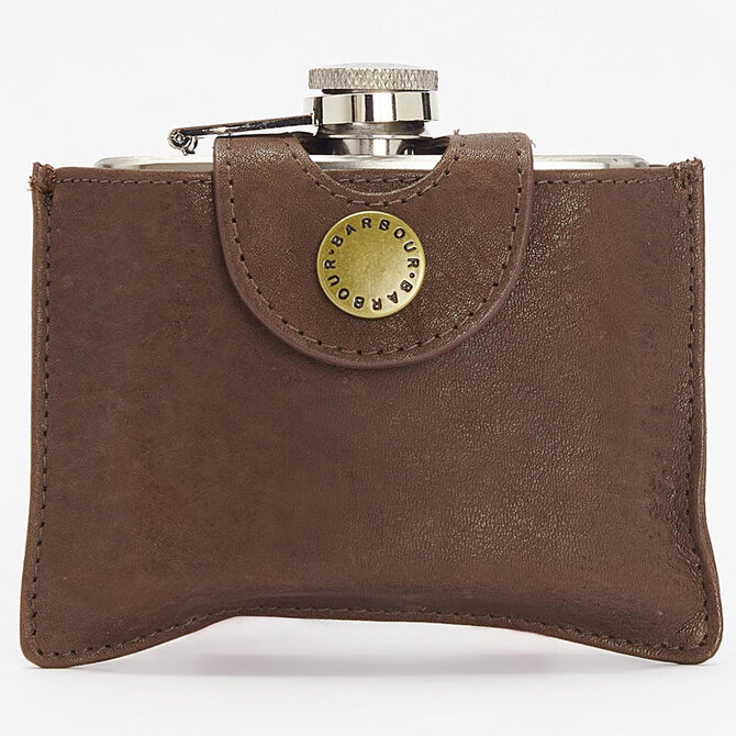 Presented in a Barbour gift box, this hip flask is made from stainless steel and comes complete with a real-leather case featuring a branded stud fastening. The screw-top lid has a hinge for easy use on the go.