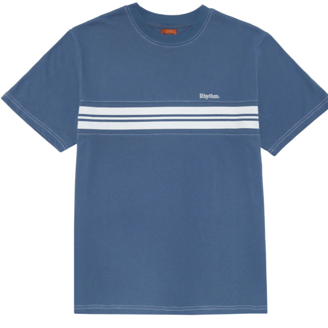 100% Cotton Tee. Classic vintage striped panel design in slate blue. Standard fitting crewneck, washed for a vintage feel!