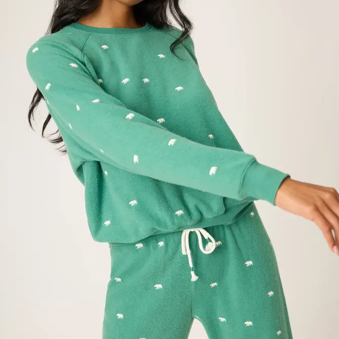 Cozy forest green crew neck sweatshirt, decorated in tiny bear motifs!