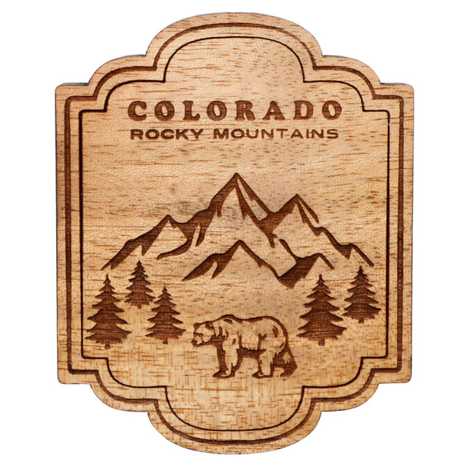 Wooden magnet with an etched illustration of a bear, pine trees, and the majestic Rocky Mountains of Colorado.