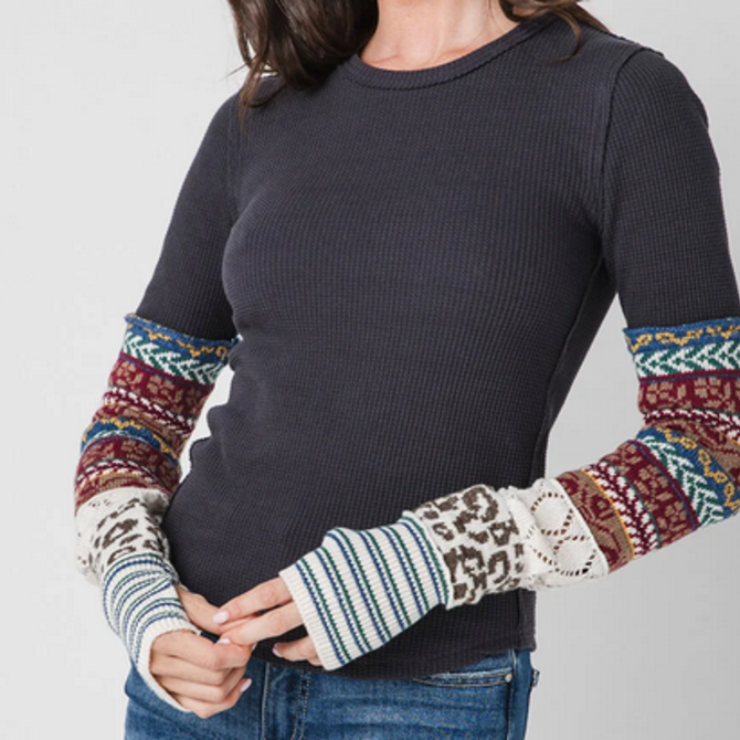 Long sleeve style top with mixed patterned cuffs and thumb-hole detailing. Soft, textured fabric and exposed seams throughout makes this a unique and effortlessly stylish addition to your fall attire!