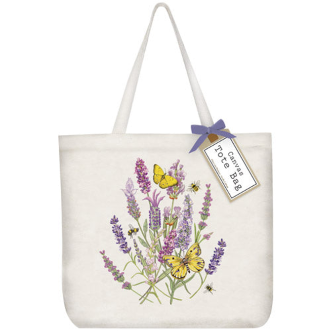 Canvas tote printed with a decorative graphic and finished with a matching bow and hang tag.