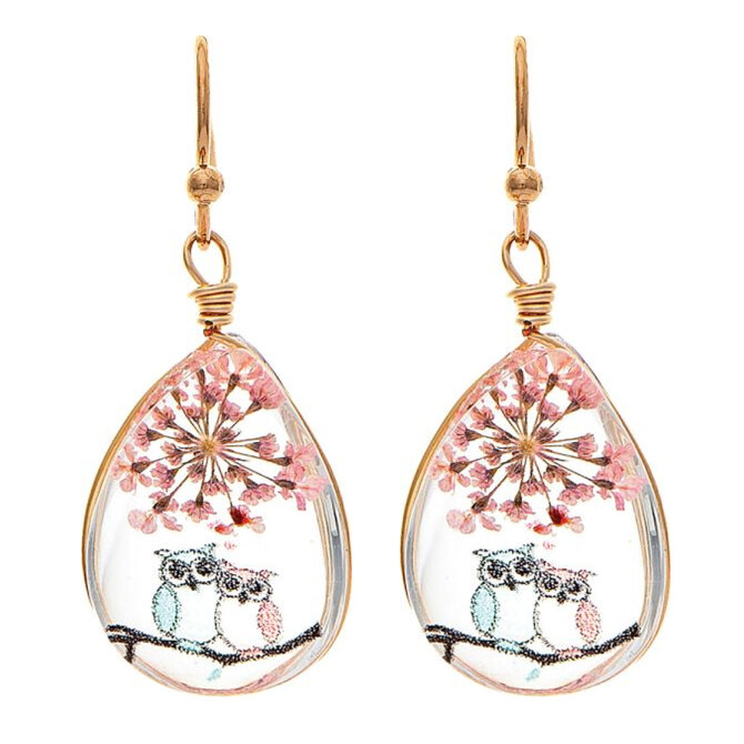 Green, Orange and Red Pressed Dried Flowers in Acrylic Round Gold Edge French Wire Earring