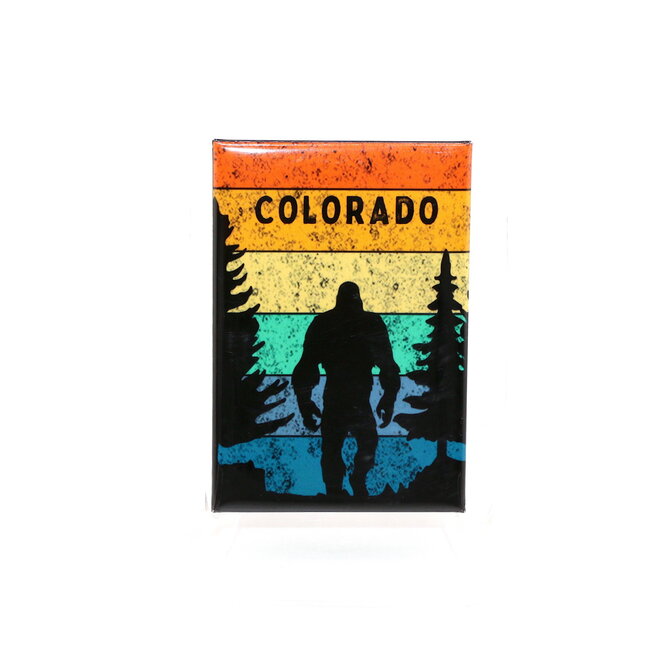 Magnet features a multi-colored mountain and pine tree scene with a Sasquatch.