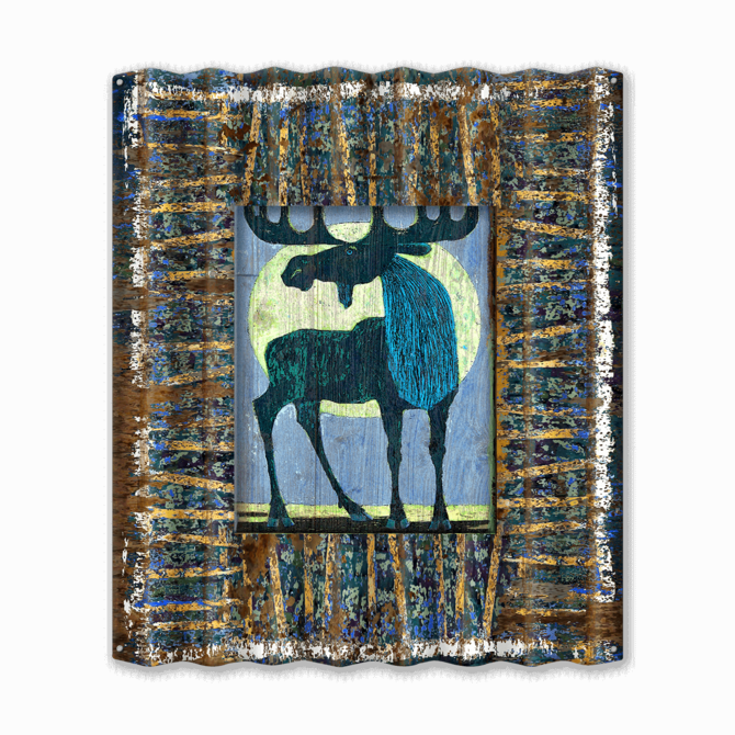A stylized moose against a luminescent moon backdrop. A unique combination of textures and color palette of blue and green to bring the creature to life. Ideal for enhancing any space with a touch of wilderness-inspired elegance.