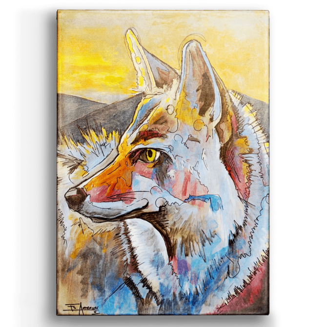 A beautiful portrayal of an alert coyote, portraying the animal in a lifelike full-profile pose. The artwork includes detailed pastel highlights that bring out the coyote’s natural coloring and textures, giving it a realistic appearance.