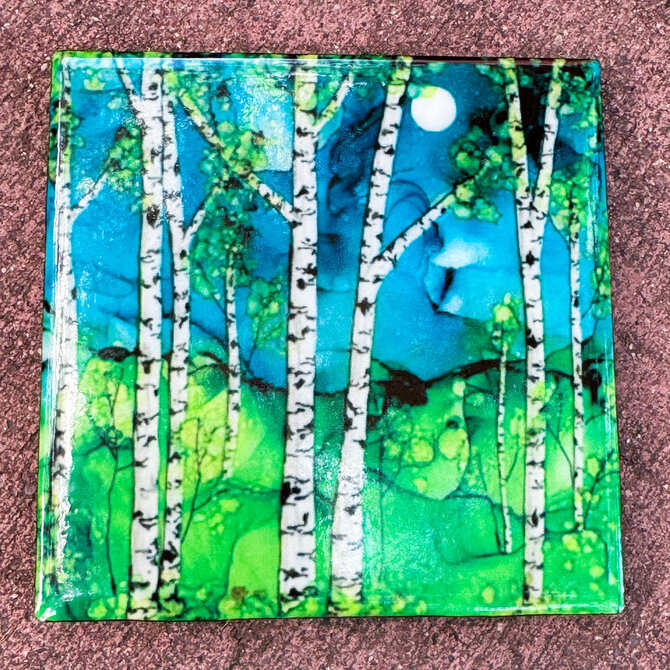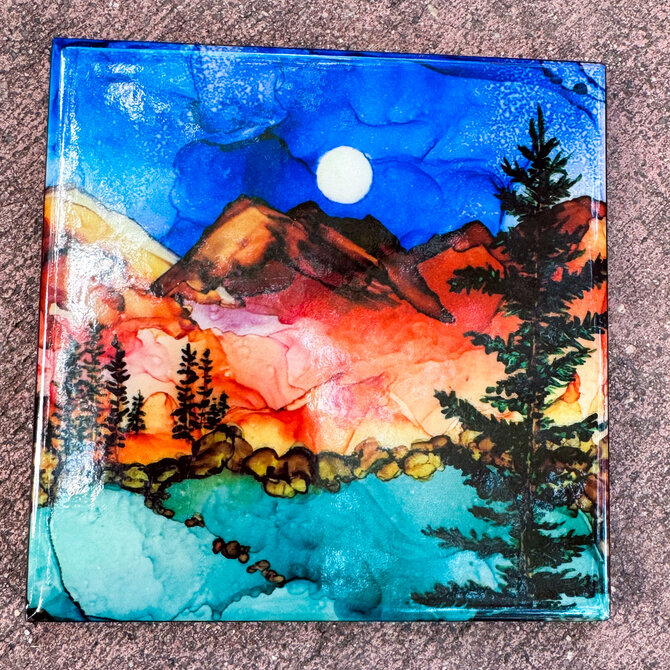 Michelle's original paintings are made with alcohol inks, primarily on ceramic tiles. Inks are moved by air-blowing tools, along with various other creative measures to finish scenes. Sealed with multiple layers of varnish, UV protectant, and art resin.