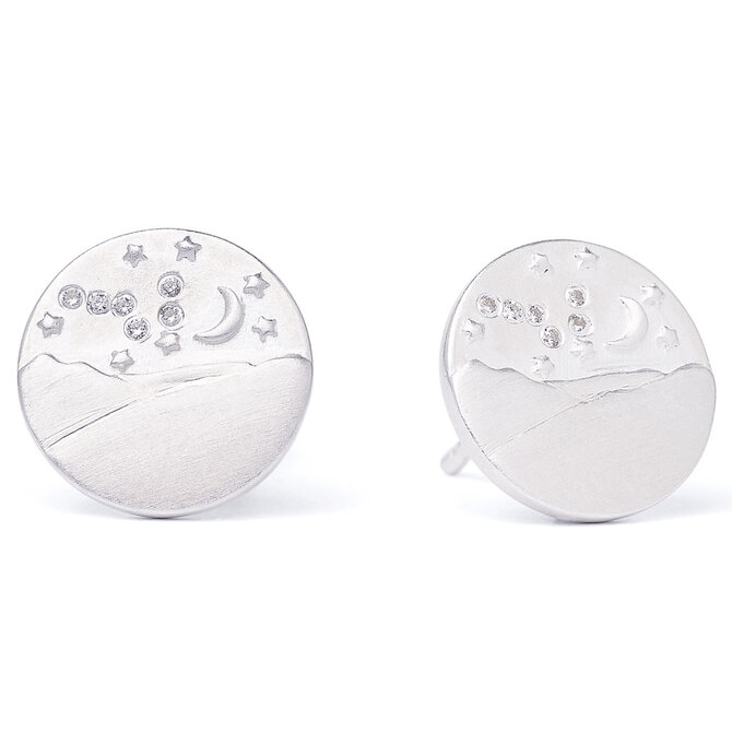 A beautiful mountain silhouette joined by a radiant sun are expertly designed onto these sterling silver with 24K plated gold stud earrings. The zirconia stones set into the pieces create a sparkling display of lights alternating between day and night.