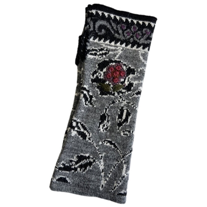 Justine Alpaca Hand Warmers – Patterned jacquard hand warmer are detailed with hand embroidery in floral designs with lots of color.