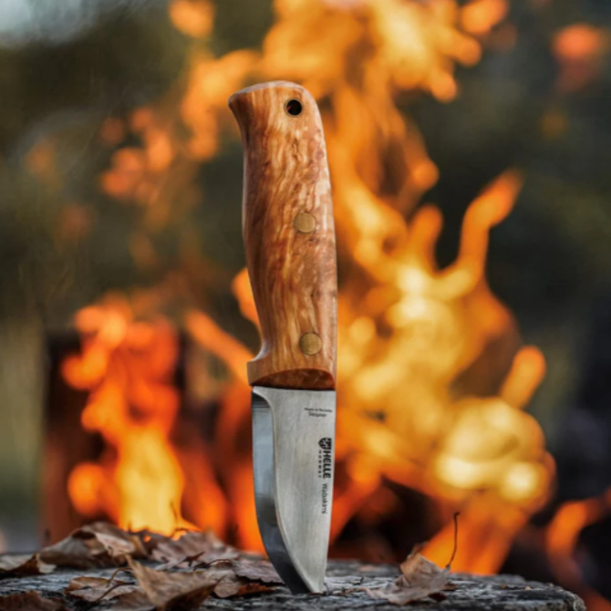 This heritage knife has a medium size handle made from carefully selected curly birch stacked together with leather and staghorn. The knife has a small but distinct finger guard and a medium size blade of the finest triple laminated Helle steel.